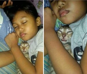 แมวดำชอบแย่งข้าวแมวส้มกิน สาวเลยเอากล่องมาตัดเป็นช่อง ให้พอดีตัวแมวส้ม เอาข้าวไว้ในนั้น แมวดำที่อ้วนเกินเลยเข้ามาแย่งไม่ได้