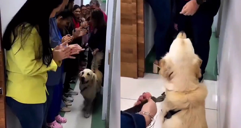 Dog shot during robbery given a warm send-off by hospital staff after undergoing three surgeries👏 pic.twitter.com/ciyroijXyE