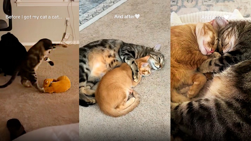 ก่อนที่ภาพจะตัดไปตอนที่รับน้องแมวอีกตัวมาเลี้ยง พบว่ากอดกันกลมเชียว เล่นด้วยกัน ทำความสะอาดให้กัน ดูน่ารักและเติมเต็มสุด ๆ