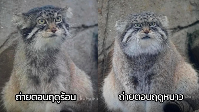นอกจากความหนาของขน และไขมันแล้ว สีขนก็จะแตกต่างกันด้วยฮะ โดยในฤดูหนาวเนี่ยสีขนของแมวพัลลัสจะจางกว่า และมีลวดลายน้อยกว่าตอนที่อยู่ในฤดูร้อน สาเหตุก็เกี่ยวกับอุณหภูมิอีกนั่นแหละ