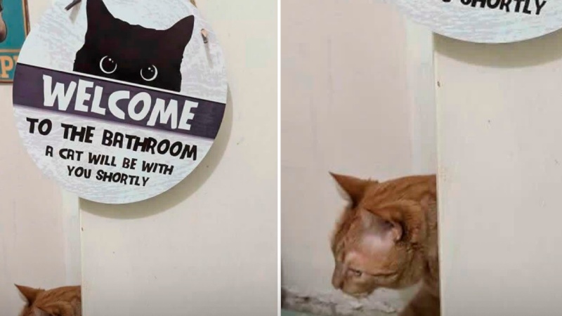 แต่ทว่าที่ลูกบิดประตูเค้ามีป้ายเขียนเอาไว้ฮะว่า “ยินดีต้อนรับสู่ห้องน้ำ เดี๋ยวแมวจะตามคุณเข้ามาในอีกสักพัก”