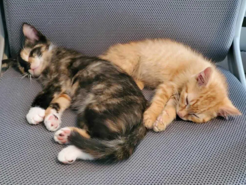 ลูกแมวทั้ง 2 ตัว ชอบนอนกอดกันบนเก้าอี้ ส่วนแม่แมวก็ไม่ต้องกังวลอะไรอีกต่อไป ตอนนี้พวกมันแค่ต้องใช้ชีวิตอย่างมีความสุขให้เต็มที่ กินเท่าที่อยากกิน นอนเท่าที่อยากนอน