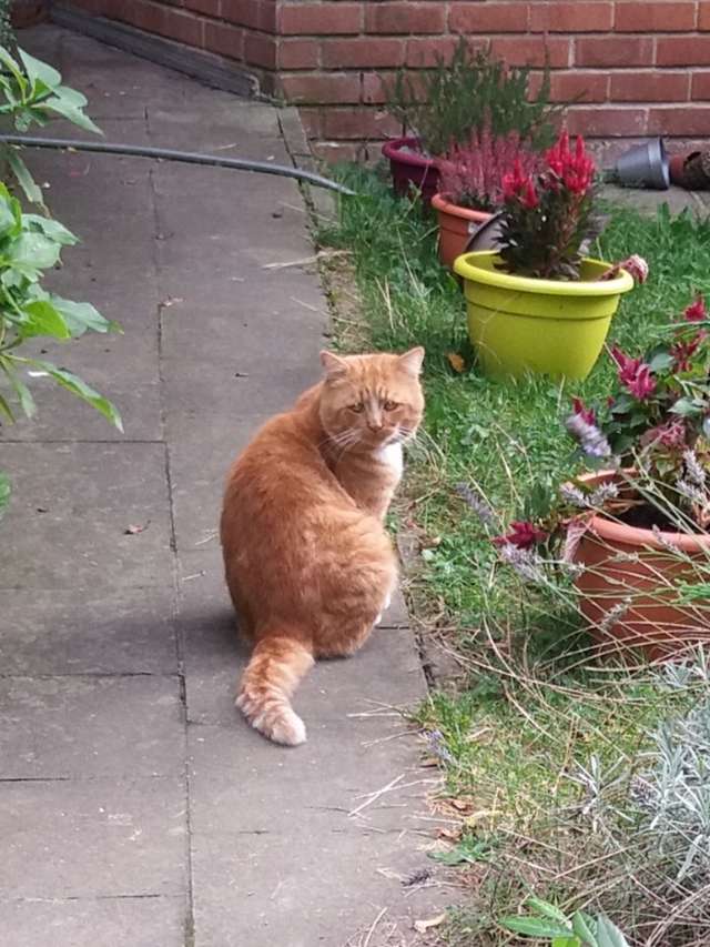 มันคือแมวส้มตัวอ้วนที่กำลังนั่งลำพังอยู่ในสวนหลังบ้านของบ้านหลังหนึ่ง ซึ่ง Lavellan ไม่เคยเห็นมาก่อน