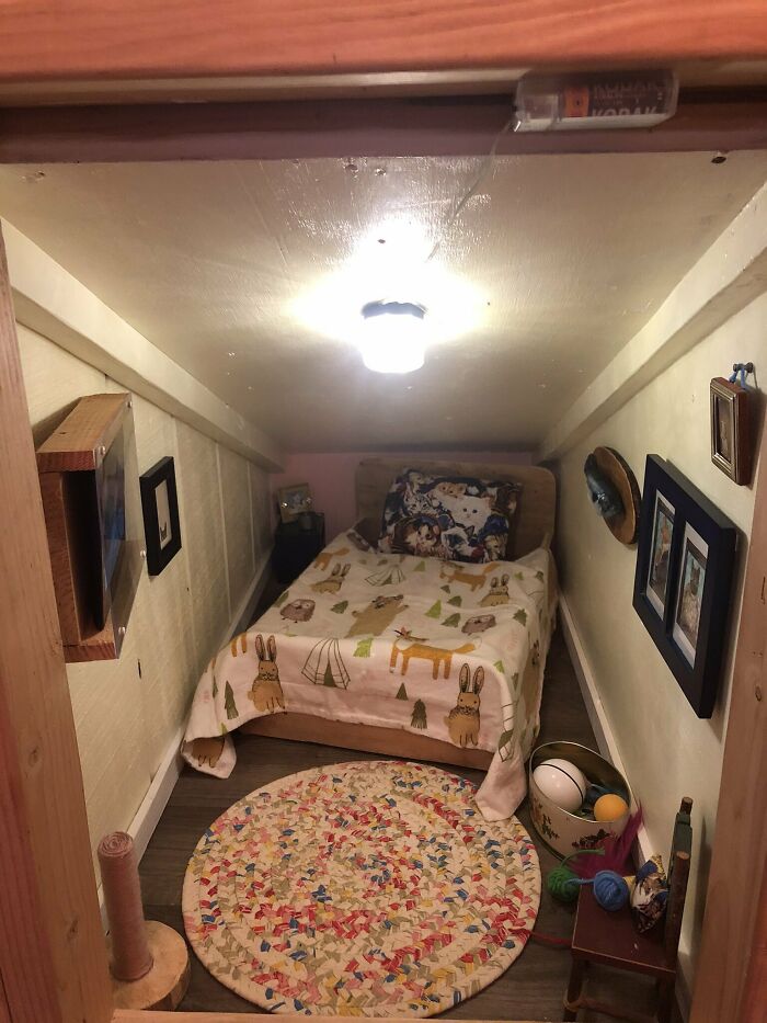 แต่ต่อให้แมวปฏิเสธเตียง ยังไงซะ พวกมันก็ต้องการที่ที่สะดวกสบายอยู่ดี นั่นเป็นเหตุผลว่าทำไมชายทาสแมวคนหนึ่ง จึงเปลี่ยนพื้นที่ใต้บันไดเป็นห้องสุดชิคสำหรับแมวของเขาที่ชื่อ Wyatt