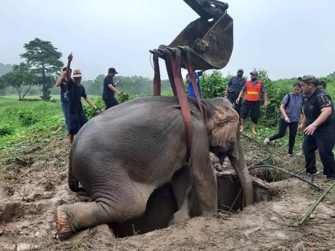 ทีม 3 ทีมช่วยเหลือลูกช้างขึ้นมาจากบ่อ