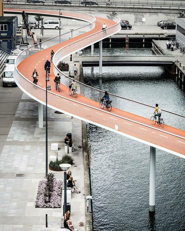 สะพานจักรยาน โค้งเป็นตัวงูบนเส้นทางเดินเล่นริมน้ำ ในเมืองโคเปนเฮเกน ประเทศเดนมาร์ก