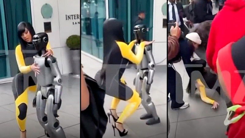ทำให้ Cardi B เสียหลัก หงายหลังล้มลง แต่มือของเธอยังไม่ปล่อยหุ่นยนต์เลยทำให้มันล้มลงไปทับเธอด้วย (โชคดีที่เธอไม่ได้รับบาดเจ็บอะไร)