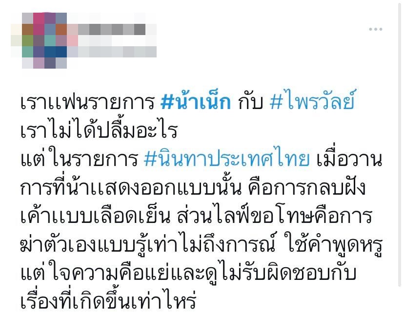 อ่านข่าว: “ทิดไพรวัลย์” ขอยุติบทบาทพิธีกร ประกาศลาออกกลางรายการ “นินทาประเทศไทย”