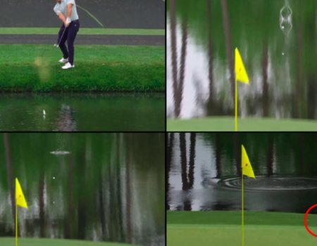ในหลุ่มที่ 16 ผู้เข้าแข่งขัน Bryson DeChambeau ก็ได้โชว์สกิลการตีสปิน เพื่อให้ลูกกอล์ฟ มันสปินกระเด้งดึ๋งบนผิวน้ำ เข้าไปสู่กรีน