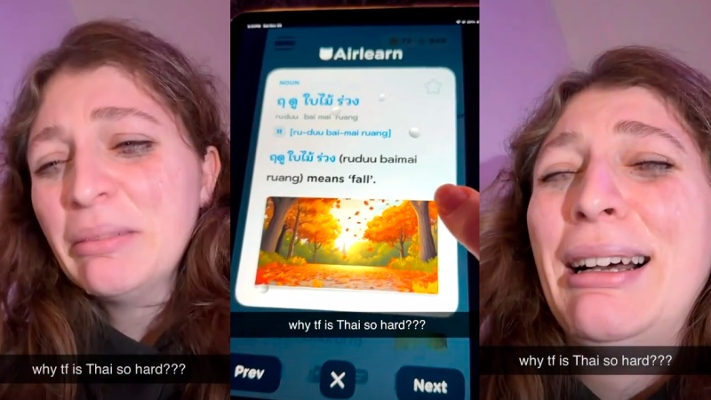 ในสภาพที่แบบท้อแท้ ร้องไห้ พร้อมกับเขียนแคปชันว่า “ทำไมภาษาไทยมันยากจังฟร๊ะ!?”