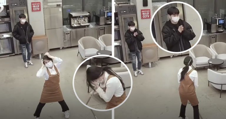 เรื่องนี้เกิดขึ้นที่คาเฟ่แห่งหนึ่งในประเทศเกาหลีใต้ ภาพจากกล้องวงจรปิดเผยให้เห็นบรรยากาศของร้านช่วงที่ไม่มีลูกค้า