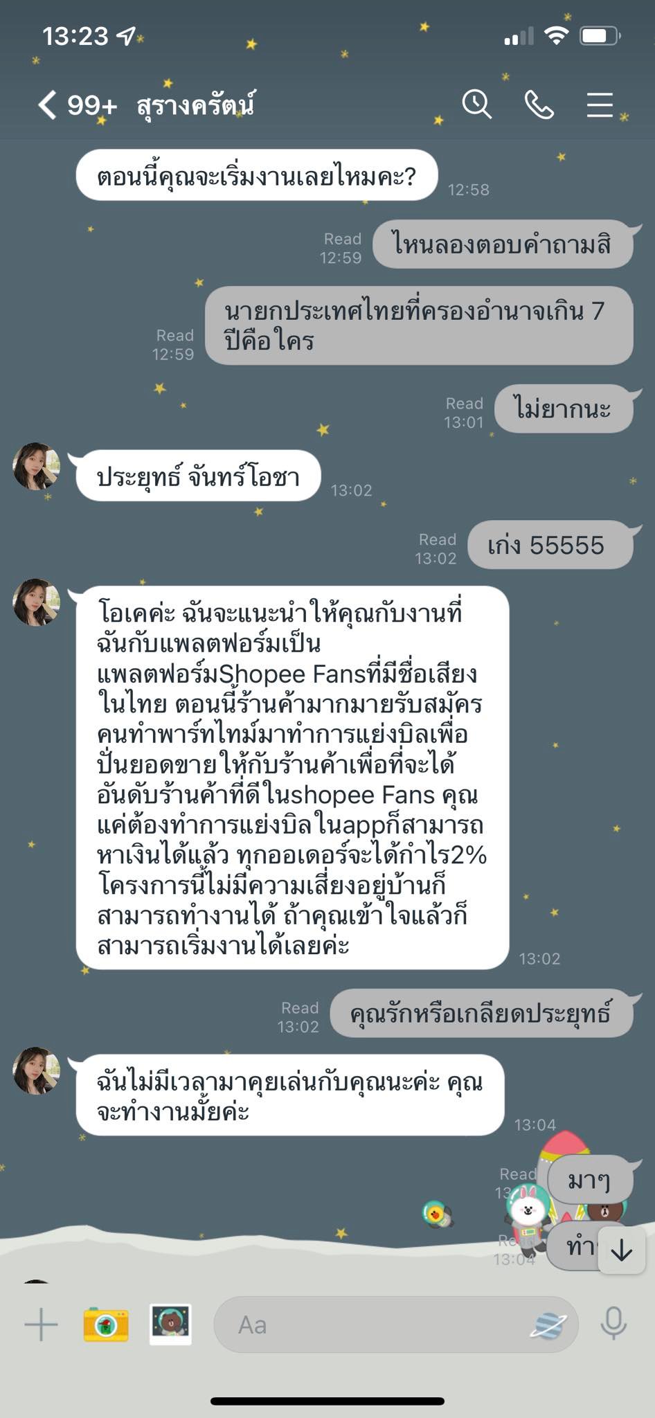 ทางเจ้าของโพสต์ได้ติดต่อไปยัง ID Line ที่ให้ไว้และทำทีพูดคุยรายละเอียดกับมิจฉาชีพ โดยได้แกล้งถามว่าเจ้าตัวกำลังพูดอยู่กับบอทหรือคนจริงๆ