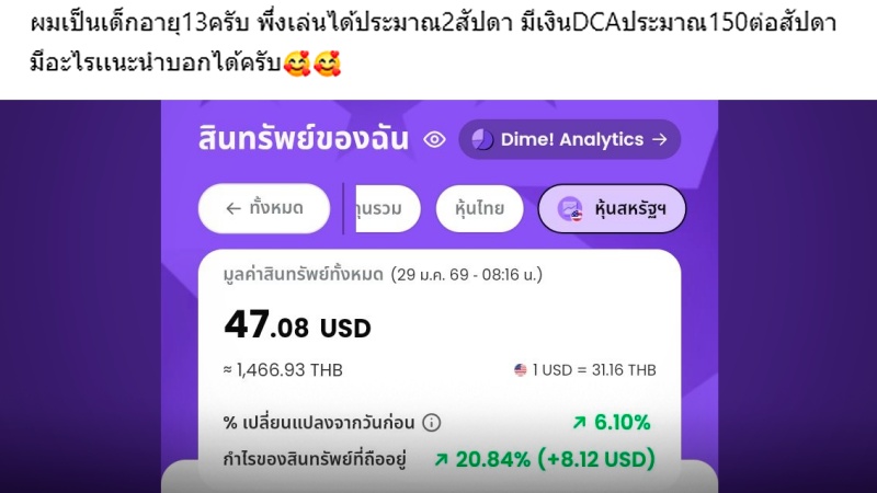 น้องบอกว่า “ผมเป็นเด็กอายุ 13 ครับ เพิ่งเล่นได้ประมาณ 2 สัปดาห์ มีเงิน DCA ประมาณ 150 บาทต่อสัปดาห์ มีอะไรแนะนำบอกได้ครับ”