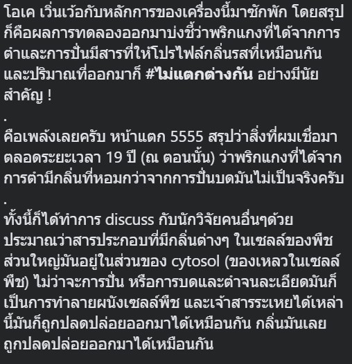 แฟนเพจ TUCK the CHEF – เชฟทักษ์ ซึ่งให้ข้อมูลความรู้เกี่ยวกับวิทยาศาสตร์ในอาหาร และเคล็ดลับการทำอาหาร ได้ออกมาเล่าถึงประสบการณ์ของตัวเอง ที่ได้มีโอกาสทดสอบเปรียบเทียบกลิ่นของพริกแกงด้วยวิธีการโขลกและปั่นในห้องแลป