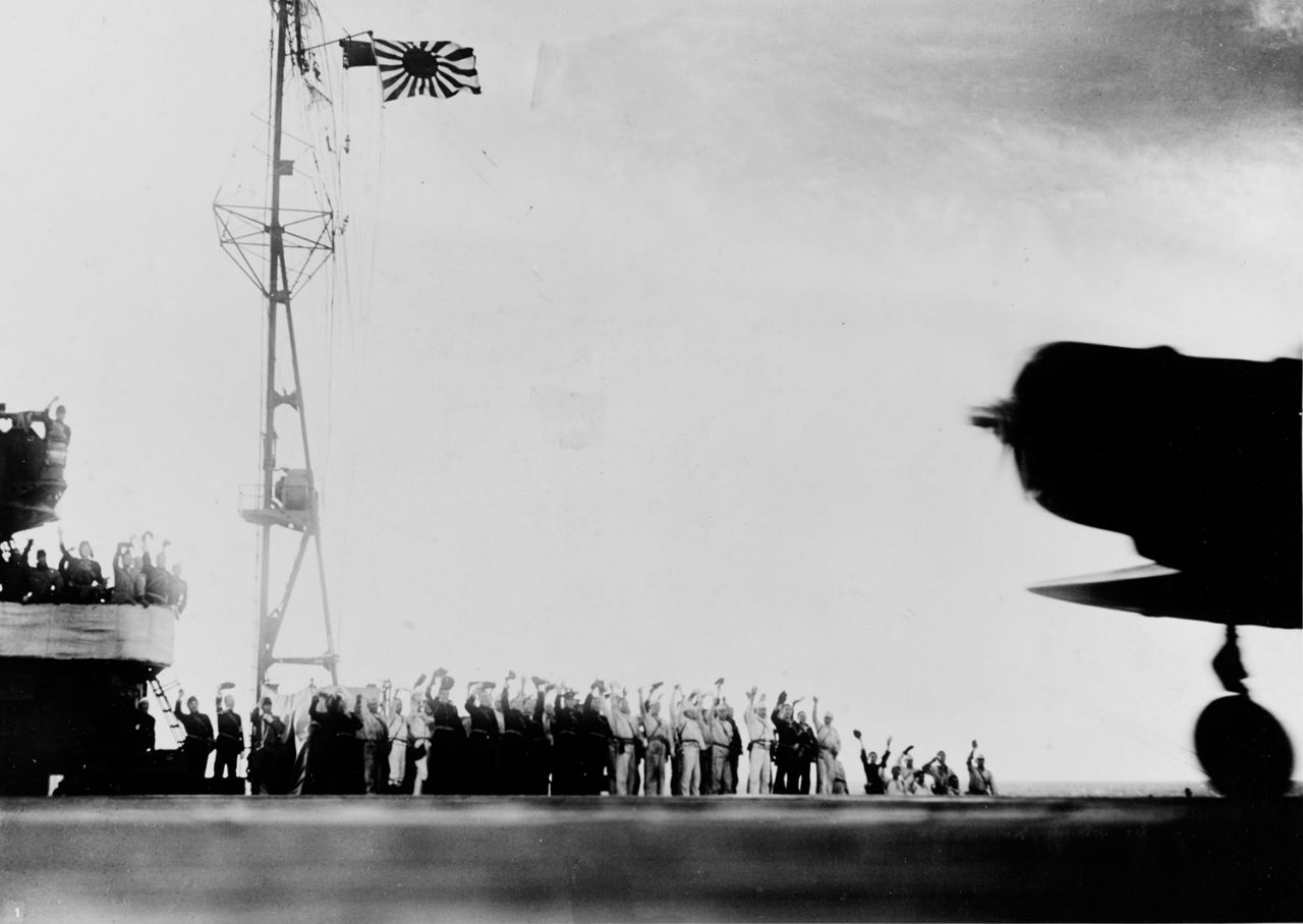 สมาชิกลูกเรือชาวญี่ปุ่นตะโกน “บันไซ” ก่อนเครื่องบินญี่ปุ่นออก