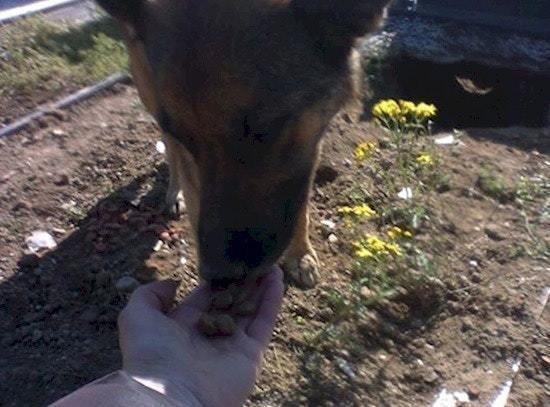 เจ้าหมาเองเห็นเธอมองนานๆ มันก็เริ่มสนใจเธอเหมือนกัน สักพักมันจึงลุกออกมาจากหลุมและวิ่งมาขอขนมจากเธอกิน
