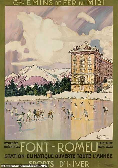 โปสเตอร์ที่มีภาพประกอบละเอียดและซับซ้อนเพื่อโฆษณาสกีรีสอร์ท “Font Romeu” ในเทือกเขาพิเรนีส