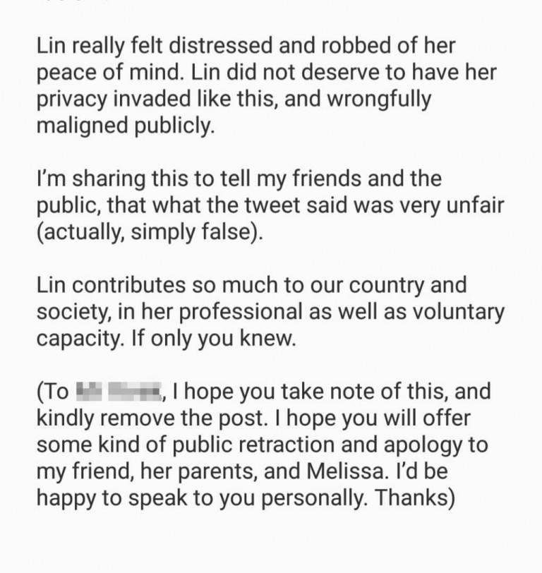 Meera ตัดจึงส่งข้อความไปหาเจ้าของโพสต์ทวิตเตอร์ที่เป็นปัญหา เพื่อขอให้เขาลบ และขอโทษ Lin และครอบครัว กับสิ่งที่เขาทำลงไป