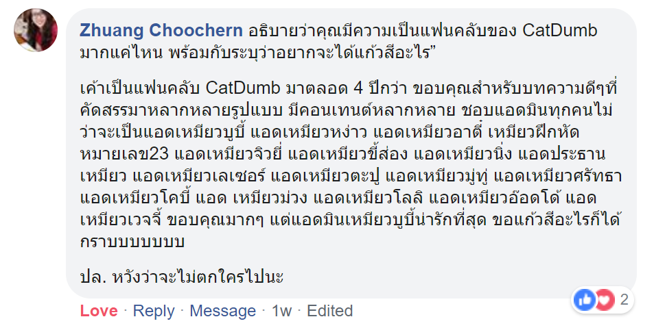 จากการพิจารณาของทางทีมงาน พบว่าคุณ Zhuang เป็นแฟนคลับของแคทดั๊มบ์ ชนิดที่ว่าติดตามจนจำชื่อแอดมินได้หลายคนมากๆๆๆๆๆๆๆๆ