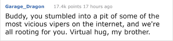 “ไม่… ฉันและคนอื่นไม่ยอมให้นายตัดสินใจทำอะไรแบบนั้น ภายนอกนายอาจจะดูเหมือนนายไม่ยอมแพ้ แต่ในดวงตาของนายมันไร้ชีวิตมากเลยนะ ฉันได้หวังว่านายล้อเล่นกับพวกเรา แต่ถ้าไม่ก็ขอให้นายดีขึ้น ห้ามลบโพสต์นี้นะ เมื่อไรที่ต้องการนายทักมาได้เลย พวกเราทั้งในนี้เคยผ่านเรื่องแบบนี้มาแล้ว ยินดีที่จะให้คำปรึกษานายเสมอ หายไวๆนะเพื่อน โรคพวกนี้ไม่ใช่เรื่องตลก และควรจะได้รับการรักษาไวๆ “