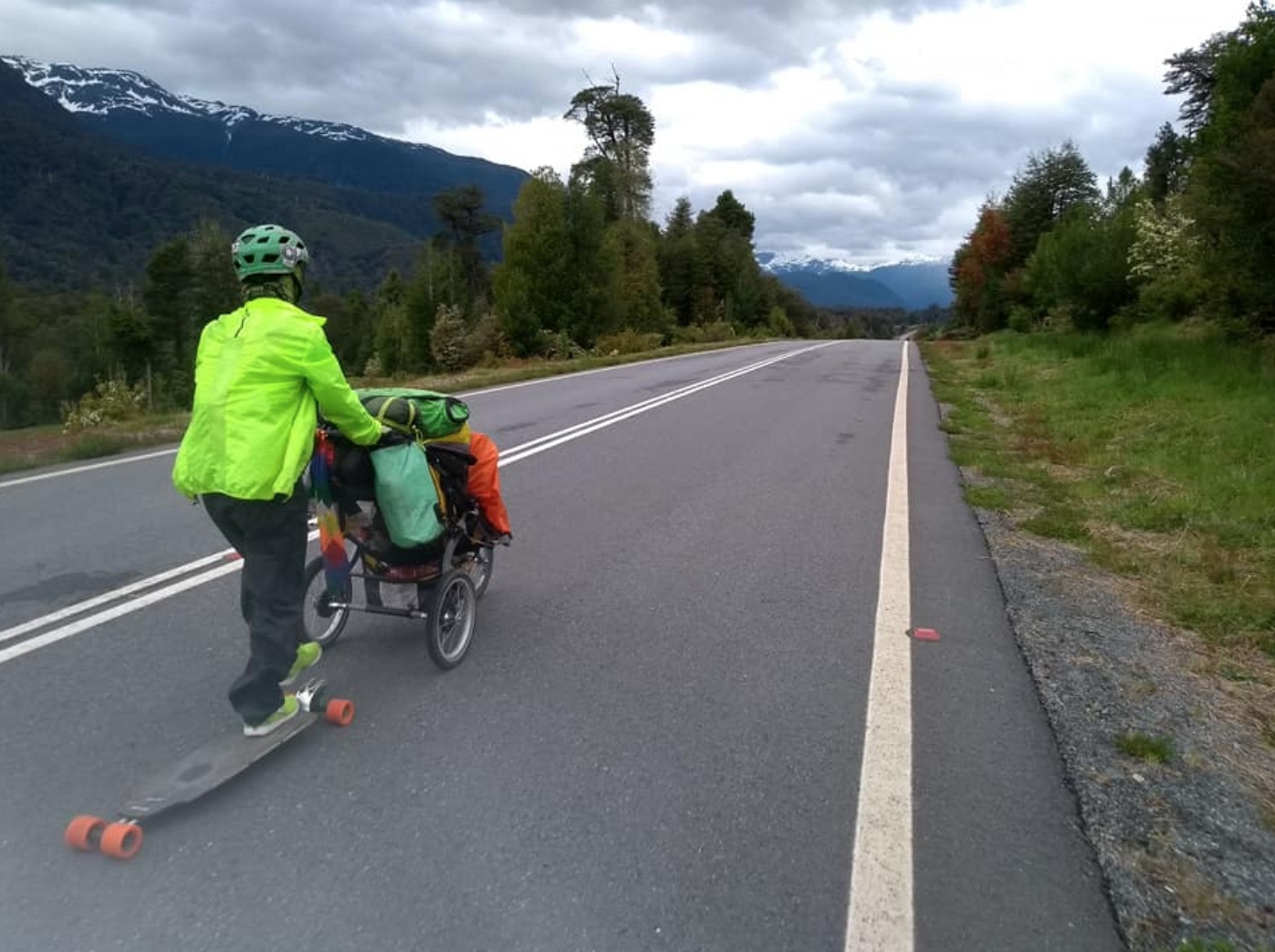 นอกจากลองบอร์ดแล้ว สิ่งหนึ่งที่ Adrian ใช้ในการเดินทางครั้งนี้ด้วยก็คือ รถเข็นคู่ใจที่เปรียบเสมือนบ้านเคลื่อนที่หลังเล็กๆ ของเขา ซึ่งบรรจุอาหารแห้ง น้ำดื่ม และอุปกรณ์ฉุกเฉินสำหรับใช้ในยามจำเป็น