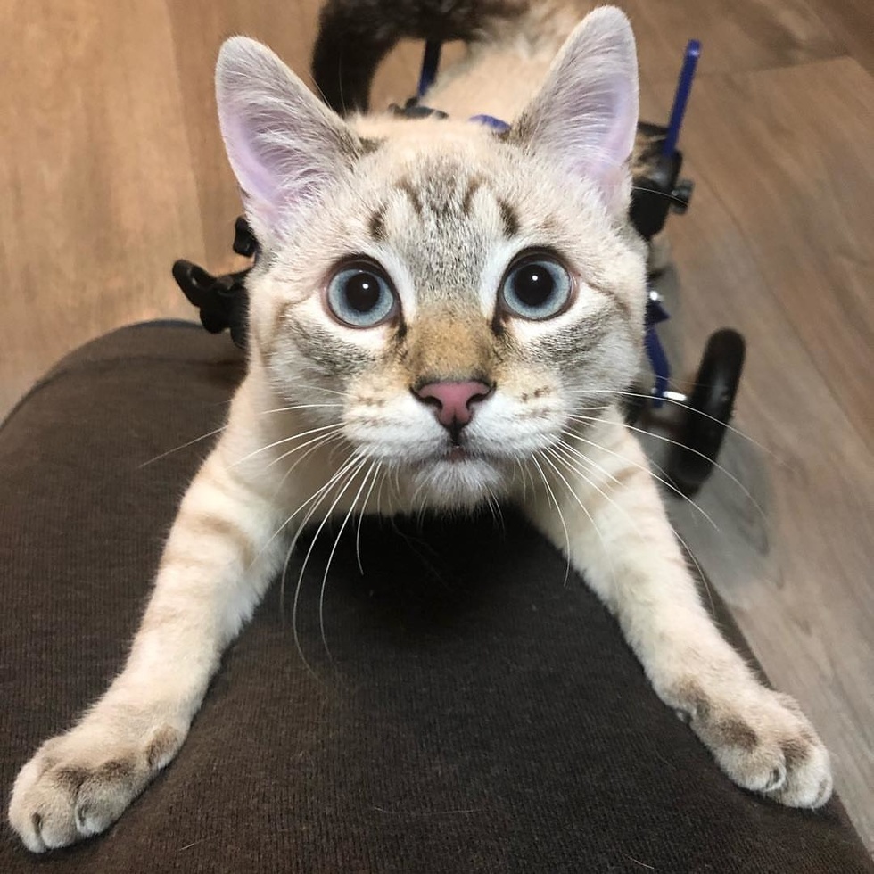 พวกเขาพบว่าลูกแมวตัวนี้ใช้การขาหลังไม่ได้ เนื่องจากมันเคยมีแผลจากการถูกบีบในช่องคลอด แม้แผลจะหายดีแล้วมันก็ยังใช้ขาเดินไม่ได้เหมือนเดิม