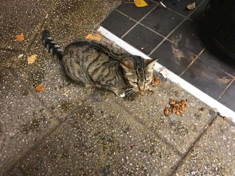 ป้ายนั้นเขียนไว้ว่า “ฉันมีบ้าน แต่ฉันมาที่นี่เพราะต้องการความรัก ความสนใจ และอาหาร ถ้าฉันแค่ร้องเมี๊ยวๆ อย่าเอาอาหารให้ฉันนะ”