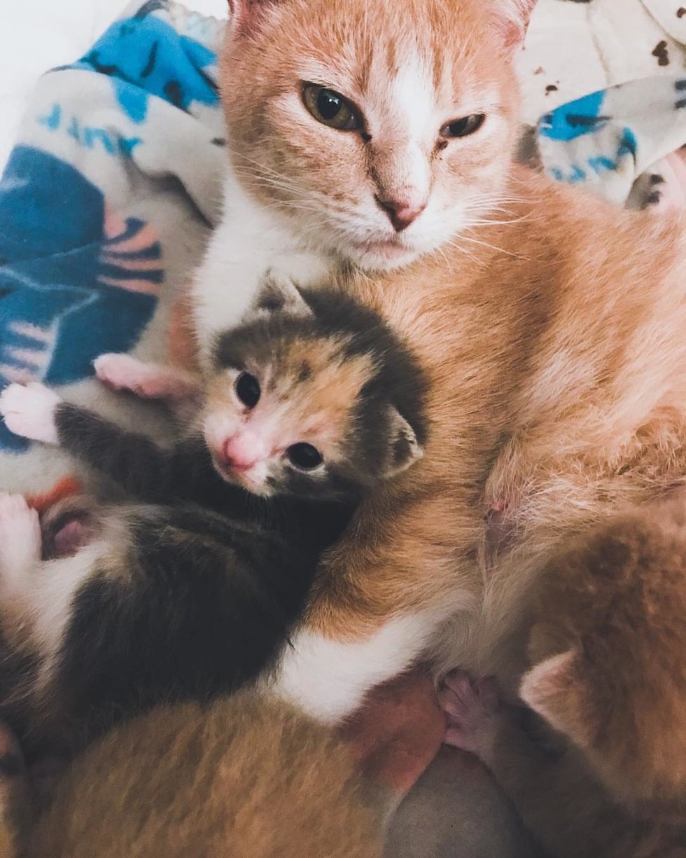 แม่แมวเหนื่อยมากจากการคลอดลูก 4 ตัว แต่มันก็ยังทุ่มเทดูแลลูกๆ ตลอดเวลาอย่างสุดความสามารถ มันทำความสะอาดลูกๆ อย่างดี และยังทำเสียงเพอร์ด้วย