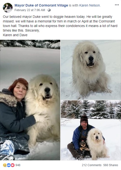 หมู่บ้าน Cormorant รัฐมินเนสโซตา ประเทศสหรัฐอเมริกามีนายกเทศมนตรีที่พิเศษ มันมีขามากกว่านายกเทศมนตรีทั่วๆ ไป…เนื่องจากมันคือเจ้าหมา Duke ผู้ถูกชาวเมืองเลือกให้เป็นนายกเทศมนตรีนั่นเอง