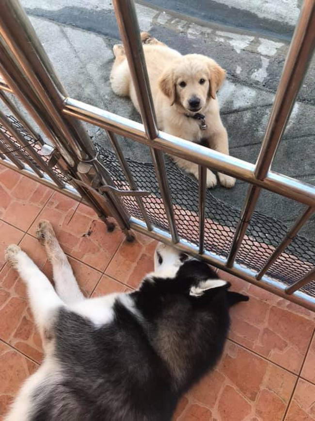 โดยเจ้าหมาโกลเด้นตัวน้อยเนี่ยชอบเข้ามาทักทายไซบีเรียนฮัสกี้ของเธอ มันจะแวะมานั่งจ้องหน้ากับสุนัขของเธอที่นอนเล่นอยู่ตรงรั้วบ้านเสมอ