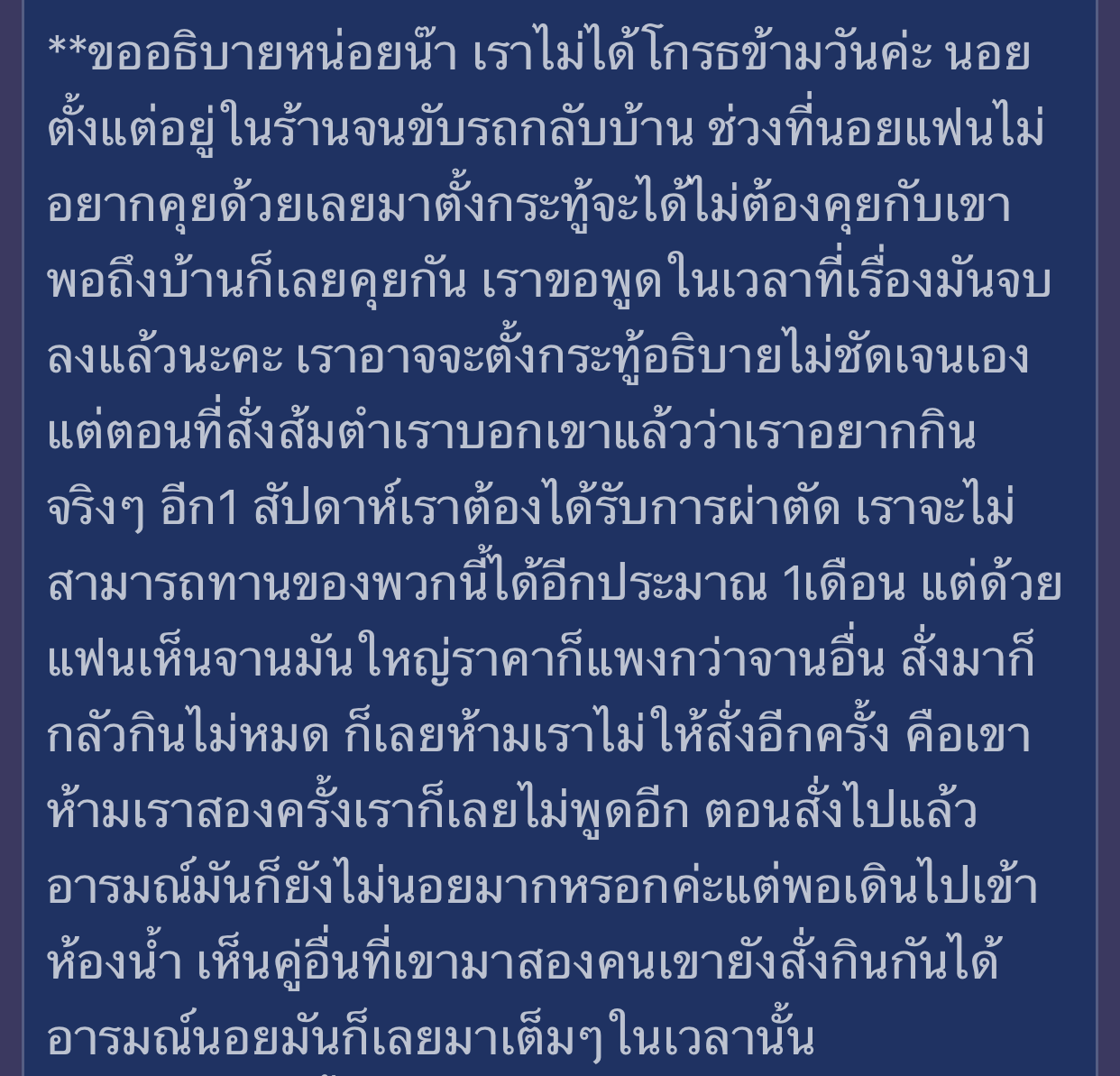 โดยในภายหลังเธอได้เข้ามาแก้ไขข้อความเพิ่มเติมหลังจากที่ได้เคลียร์กับแฟนเป็นที่เรียบร้อยแล้วจึงได้ปรับความเข้าใจกันและขอโทษกันเป็นที่เรียบร้อยแล้ว ทางเจ้าของกระทู้ก็อธิบายในส่วนของตัวเองว่าเธออยากทานมากจริงๆ เพราะเธออาจจะไม่ได้ทานมันอีกกว่า 1 เดือนเนื่องจากต้องเข้ารับการผ่าตัด