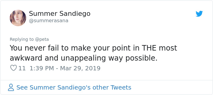 หลายปีก่อน ฉันก็เคยโดน PETA จ้างให้วาดอะไรคล้ายๆ แบบนี้เหมือนกัน แต่ฉันโดนสั่งแก้รัวๆ เลย สงสัยนัดวาดคนนี้คงวาดได้ตรงใจพวกเขาสักที