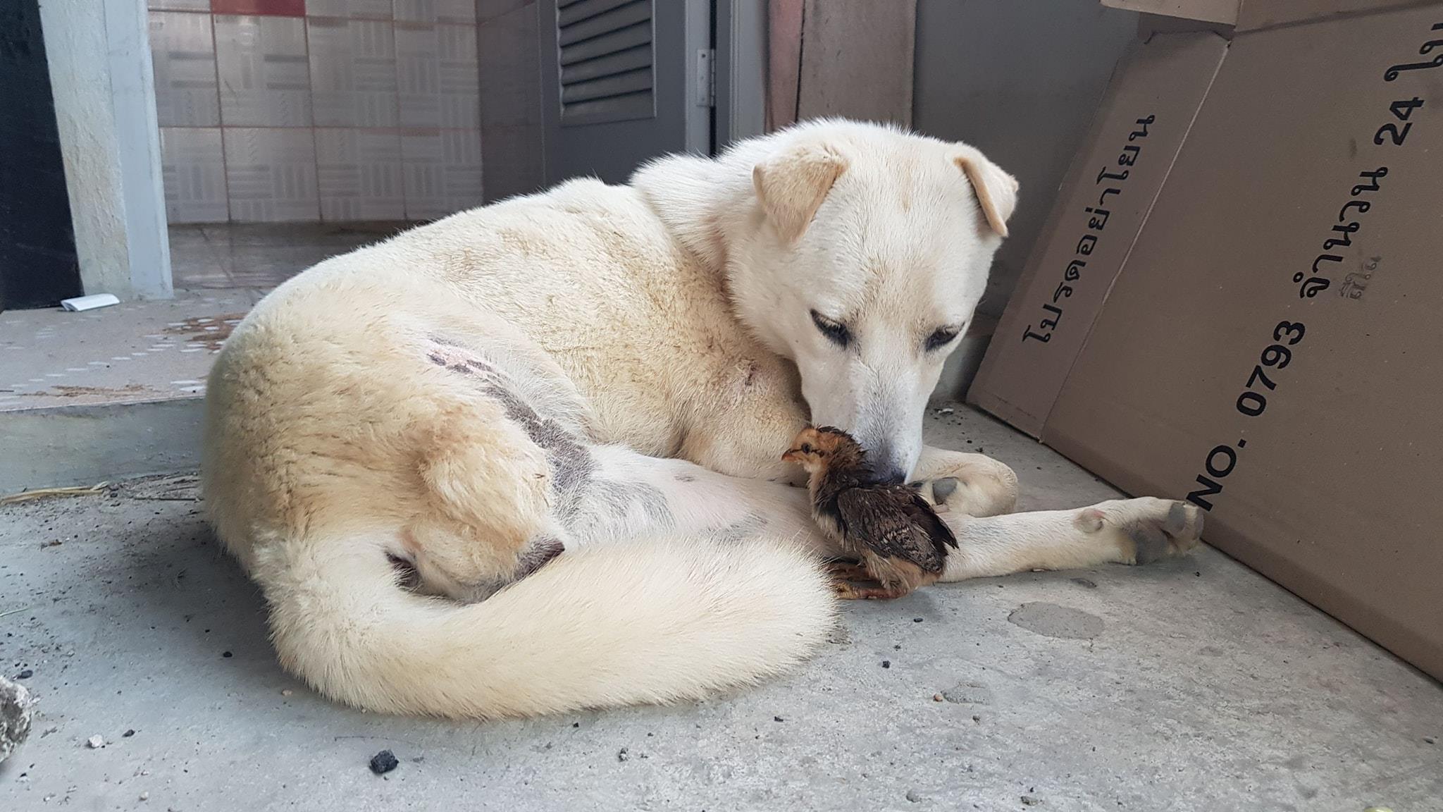 ตอนนั้นปังตอค่อนข้างมีแผลอยู่เยอะ ทั้งบนปีกและขาข้างหนึ่ง ท่าเดินของมันจึงค่อนข้างไม่ปกติเท่าไหร่…ช่วงกลางวัน หลังโฟโต้วิ่งเล่นจนเหนื่อย แล้วมานอนพักหน้าห้องน้ำ ปังตอก็จะรีบเข้ามาซุกตัวพี่หมาทันที