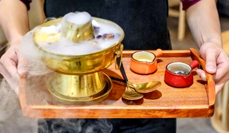 โดยลูกค้าจะสามารถเลือกได้ว่าจะรับน้ำซุปอะไร ระหว่างนมสดและชานม และต่อมาก็สามารถเลือกได้ว่าจะใส่น้ำแข็งแห้งเพื่อทานแบบเย็นหรือจุดไฟเพื่อทานแบบร้อนก็สามารถทำได้