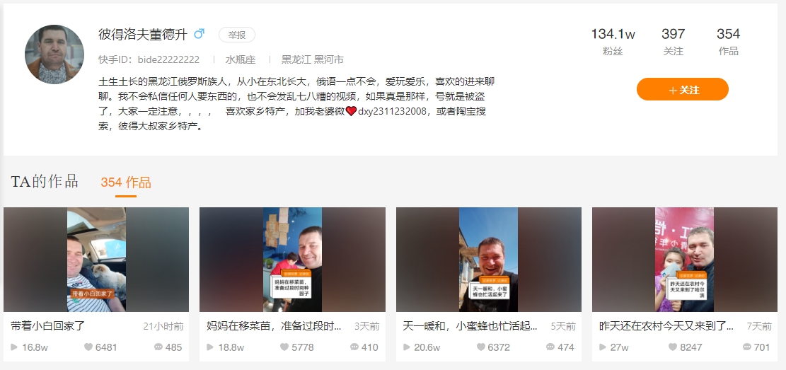 คุณลุง Desheng มีผู้ติดตามในในแอพพลิเคชั่น Kuaishou มากกว่าล้านคน ซึ่งเขาได้รับฉายาว่า ““Uncle Petrov” (彼得大叔) ซึ่งมาจากนามสกุลรัสเซียของครอบครัวเขานั่นเอง