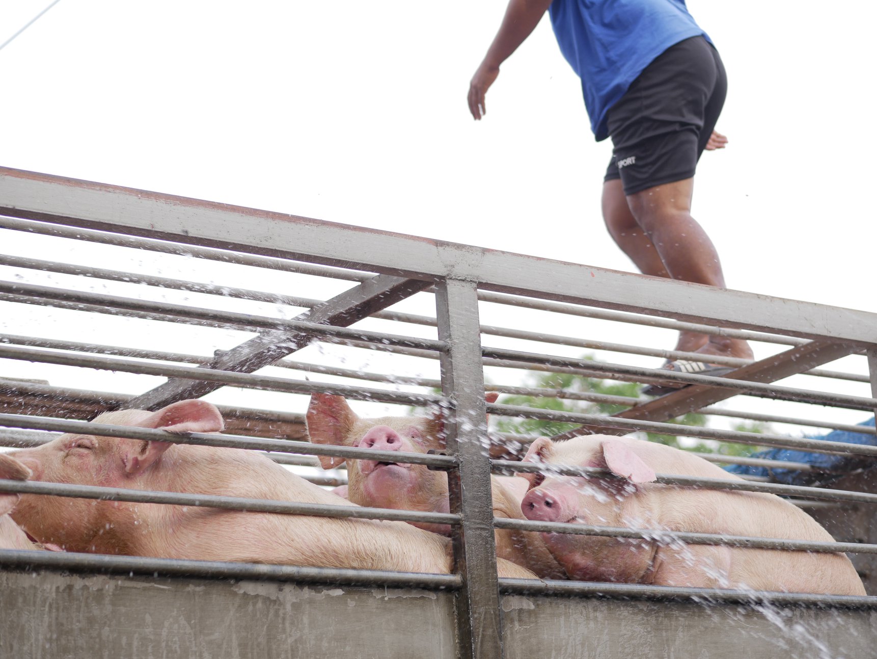 #5 หลังรถบรรทุกที่แปรสภาพเป็นที่ลำเลียงหมู คนงานก็ทยอยลำเลียงหมูขึ้นไปอย่างยากลำบาก