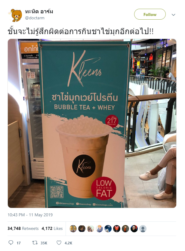 ทวิตเตอร์ ทะนิด อาร์ม ได้บังเอิญผ่านไปเจอป้ายโฆษณายอดชาไข่มุกที่ว่านี้ ซึ่งเป็นป้ายของร้านอาหารเพื่อสุขภาพร้านหนึ่ง ซึ่งในทวีตได้ใส่แคปชั่นเอาไว้ว่า ‘ชั้นจะไม่รู้สึกผิดต่อการกินชาไข่มุกอีกต่อไป!!’