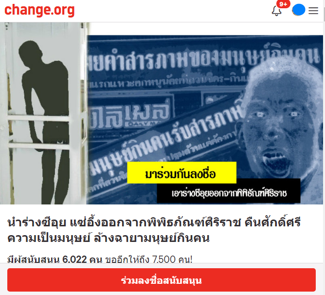 ยอดผู้ลงชื่อสนับสนุนในวันที่ 14 พฤษภาคม 2019 พุ่งสูงถึง 6,000 คนแล้ว โดยได้มีการตั้งเป้าให้ถึง 7,000 คนเพื่อนำรายชื่อไปเสนอให้กับทางพิพิธภัณฑ์ศิริราชต่อไป