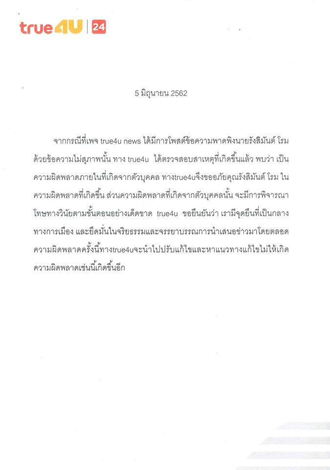 หลังจากความผิดพลาดดังกล่าวได้ถูกแชร์ออกไปเป็นจำนวนมาก ล่าสุดเมื่อช่วงเช้าวันนี้ (6 มิ.ย. 2019) ทางเพจที่ได้ทำการพิมคอมเมนต์นั้นลงไปก็ได้ออกมาโพสต์แถลงการณ์ขอโทษในเรื่องที่เกิดขึ้น