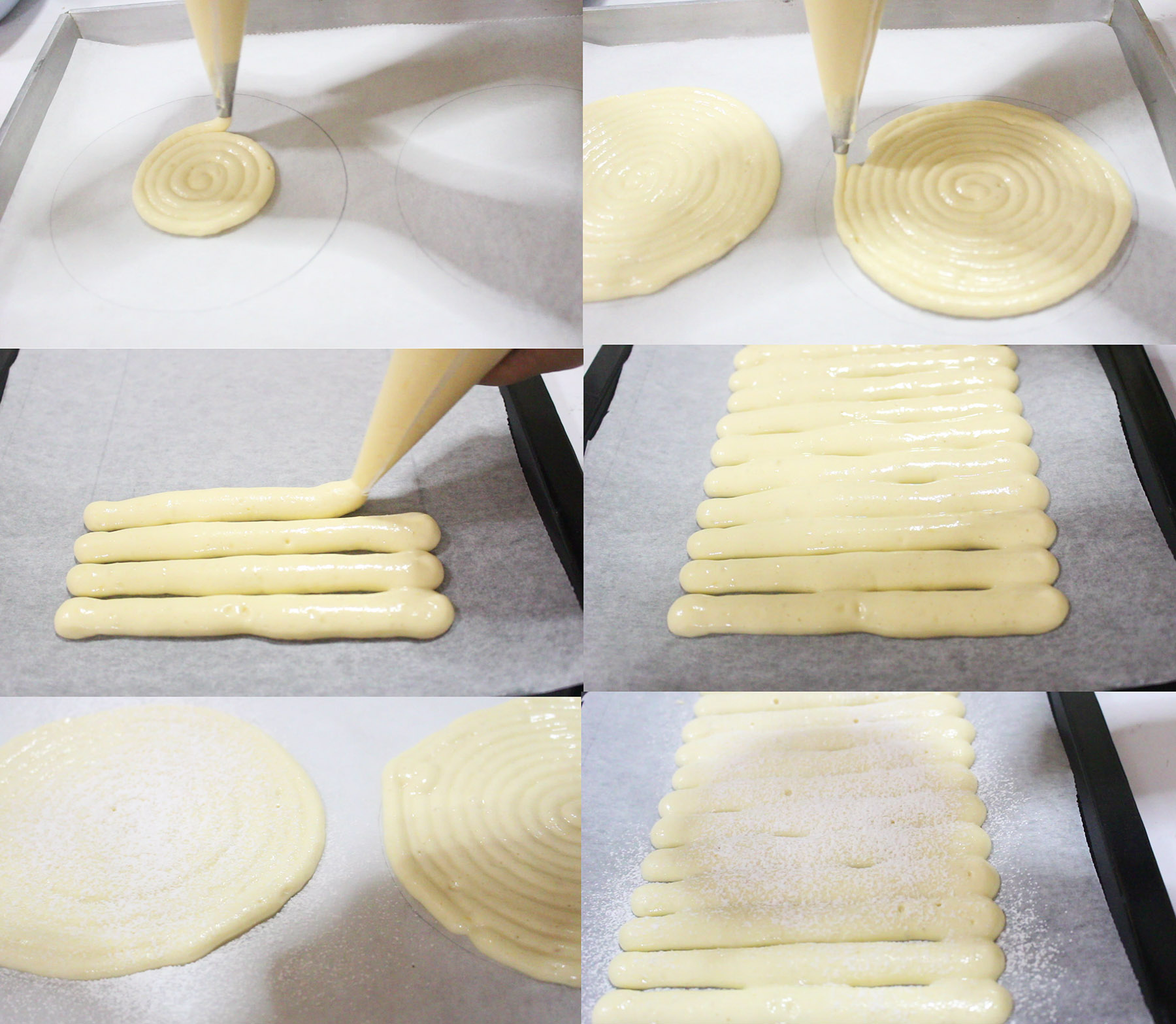 จากนั้นบีบเป็นเส้นยาวประมาณ 6-7 ซ.ม. ให้ห่างกันสักเล็กน้อย บีบต่อกันไปเรื่อยๆจนหมดค่ะ หลังจากนั้นร่อนน้ำตาลไอซิ่งให้ทั่ว แล้วพักไว้ 5-10 นาที ให้น้ำตาลซึมเข้าไปในตัวเค้ก