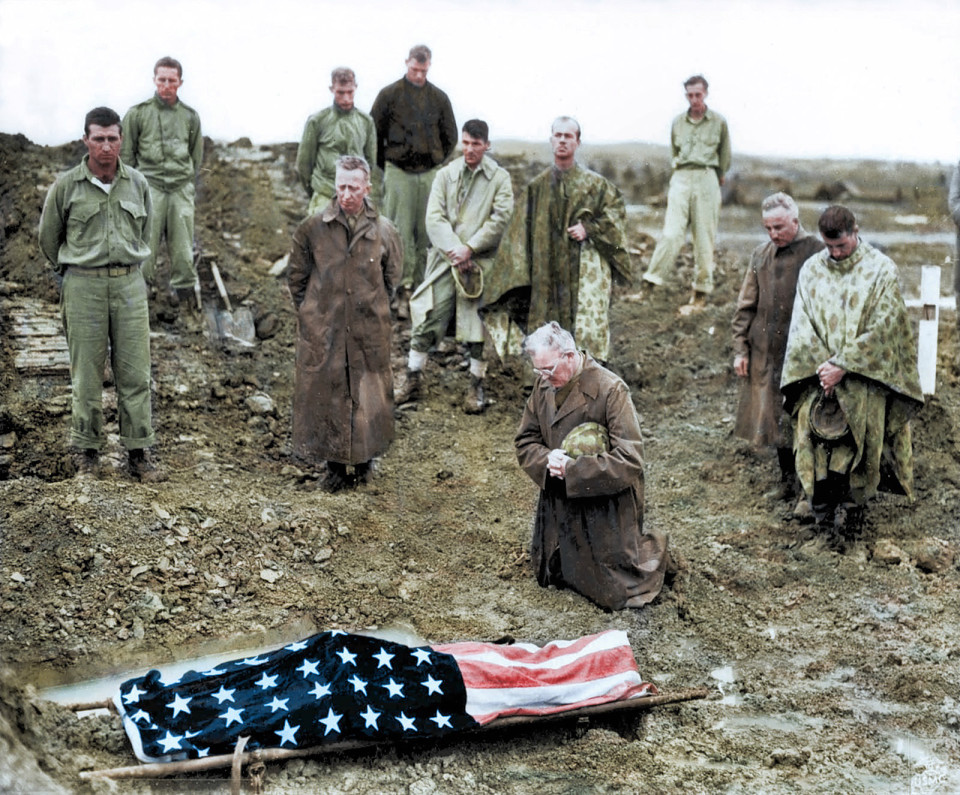 การเคารพศพของนายทหาร Mike Fenton ผู้เสียชีวิตในการโจมตีโต้กลับของญี่ปุ่นที่โอกินาว่า เมื่อปี 1945