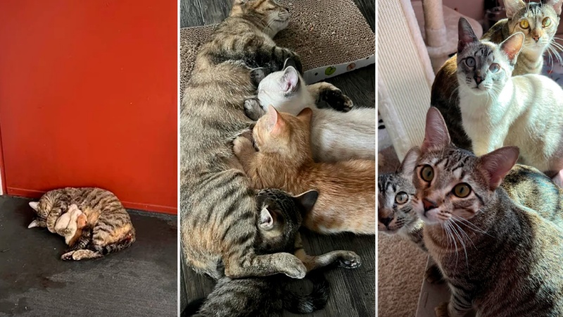 เจอแม่แมว นอนกอด ให้นมลูก 6 ตัว บนพื้นเย็น ๆ พี่ชายเลยตัดสินใจ รับมาเลี้ยงทั้งครอบครัว