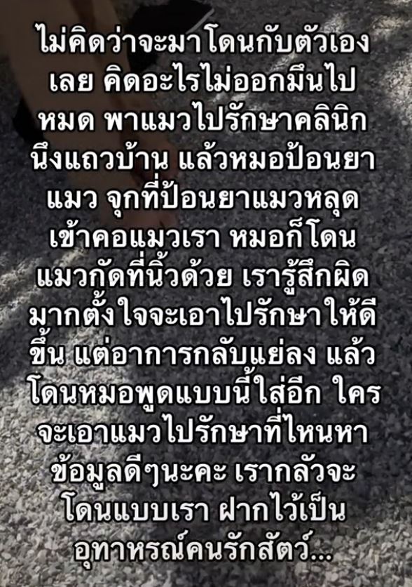 โดยเธอเล่าว่า “ไม่คิดว่าจะมาโดนกับตัวเองเลย คิดอะไรไม่ออกมึนไปหมด พาแมวไปรักษาคลินิกแถวบ้าน”