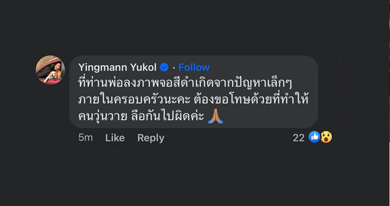 “ที่ท่านพ่อลงภาพจอสีดำเกิดจากปัญหาเล็ก ๆ ภายในครอบครัว ต้องขอโทษด้วยที่ทำให้คนวุ่นวาย ลือกันไปผิด ตอนนี้พ่อได้พัก FB ไปแล้ว”