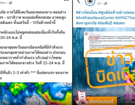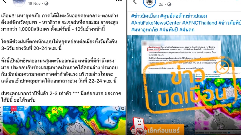 – ต่อมาวันที่ 22 พ.ย. เพจเฟซบุ๊ก Anti-Fake News Center Thailand ที่เป็นเพจของหน่วยงานรัฐ เอาโพสต์ของเพจ ที’ ลมฟ้าอากาศ มาแปะป้ายว่าเป็น “ข่าวบิดเบือน” ไม่เป็นความจริง