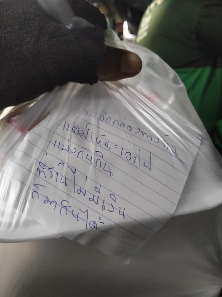 สิ่งที่เกิดขึ้นหลังจากนั้นคือภาพของไรเดอร์ไปรับอาหารจากร้าน โดยในห่อมีโน๊ตฝากถึงลูกค้าระบุว่า “อีกกล่องทางร้านแถมให้นะ เอาไปแบ่งกันกิน ที่ร้านไม่มีเงินก็มากินได้”