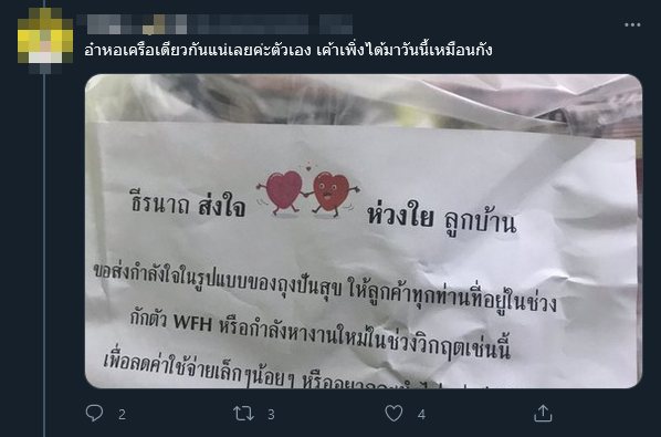ทาง…จึงมีความเห็นใจและเป็นห่วงลูกค้าเป็นอย่างมาก จึงได้จัดทำถุงยังชีพแจกให้กับลูกค้าทุกท่าน เพื่อเป็นกำลังใจเล็กๆ น้อยๆ จากทางเราค่ะ ดูแลสุขภาพกันด้วยนะคะ ขอให้ทุกท่านปลอดภัย เราจะผ่านไปด้วยกันนะคะ สู้สู้”