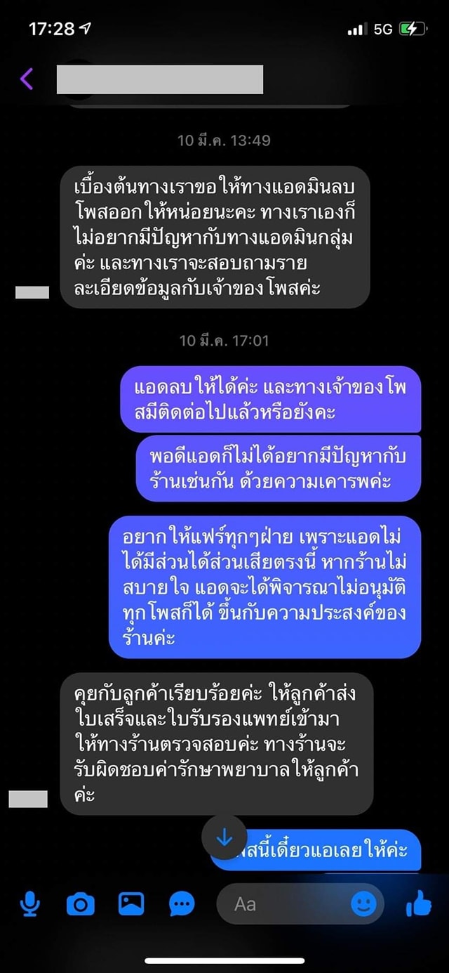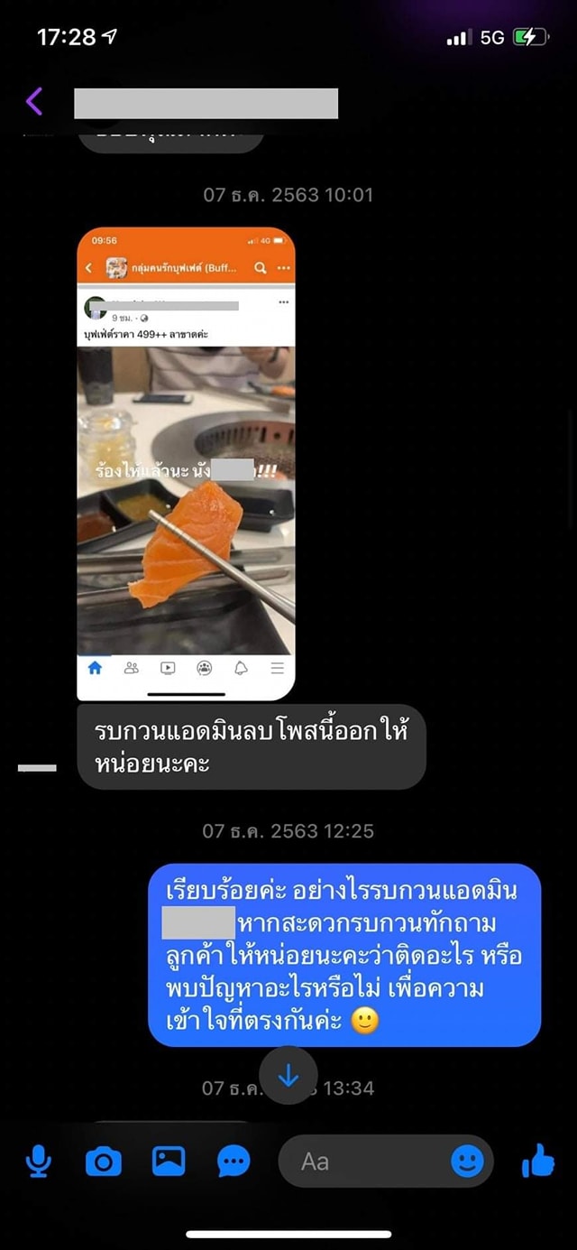 โดยระบุว่า ปัญหาทางด้านบริการเกิดขึ้นจริง และติดต่อแก้ปัญหากับลูกค้าแล้ว จากนั้นจึงขอให้แอดมินช่วยลบโพสต์ให้ จำเป็นต้องปกป้องชื่อเสียงของร้าน