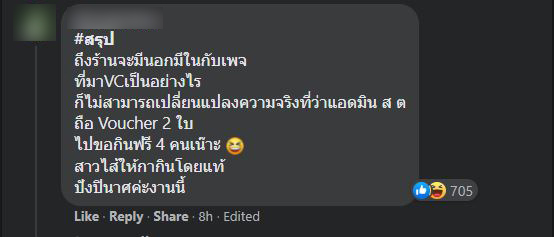 พร้อมชี้แจงสาเหตุการให้ Voucher ว่าเป็นการขอบคุณแอดมินกลุ่ม ที่สร้างกลุ่มขึ้นมาทำให้ร้านได้รู้ความคิดเห็นของลูกค้าโดยตรงได้ จะได้นำความคิดเห็นมาปรับปรุง และแก้ปัญหาได้ทันท่วงที