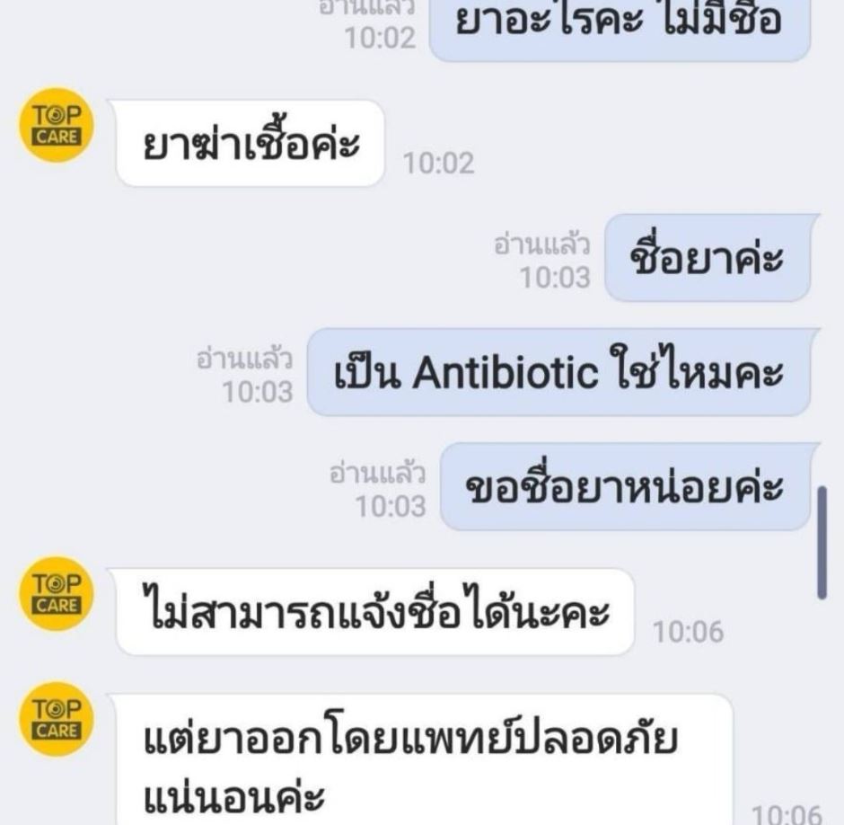 เมื่อสอบถามไปก็ได้รับคำตอบว่าเป็นยาฆ่าเชื้อเฉยๆ ไม่สามารถแจ้งชื่อยาได้